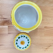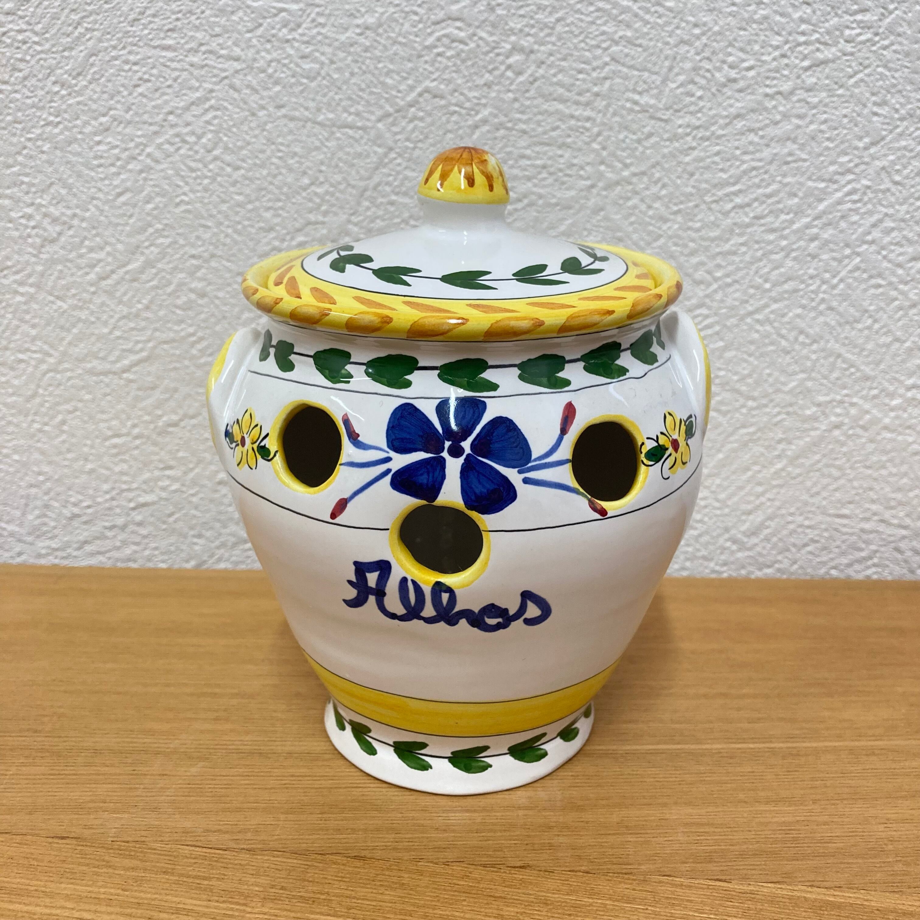 ポルトガル陶器 ガーリックポット(ホワイトイエロー)です。(サイズ:直径約12cm・高さ約14.5cm)