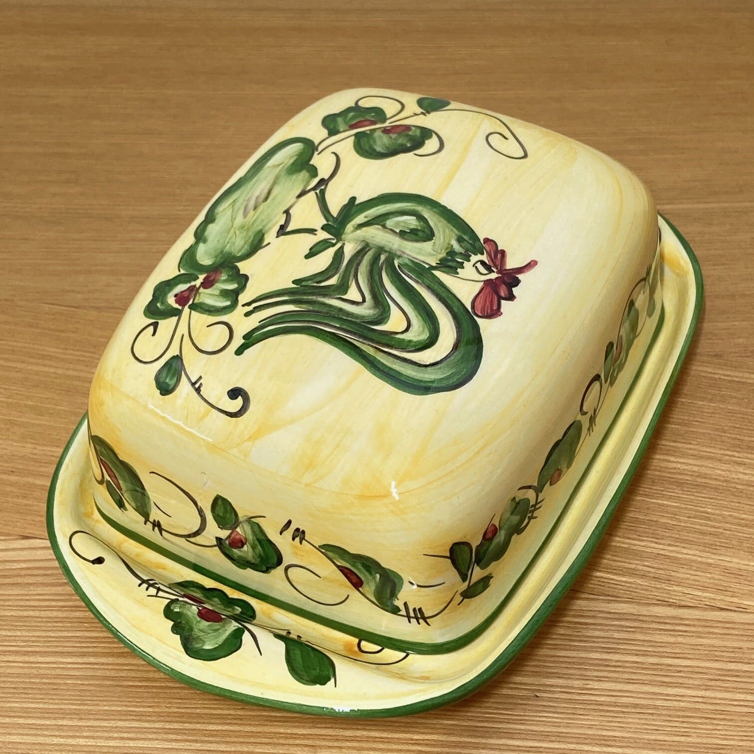 このバターケースは、ポルトガルの職人による手描きのデザインが魅力的です。にわとりのモチーフが特徴的で、持ち手部分と蓋には、美しい植物模様が施されています。一つ一つ異なる表情を持ち、まるで温かみのある物語を語りかけてくるようです。
